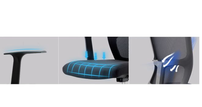 Accoudoirs fixes en PP noir, mousse haute densité, maille fraîche et respirante
